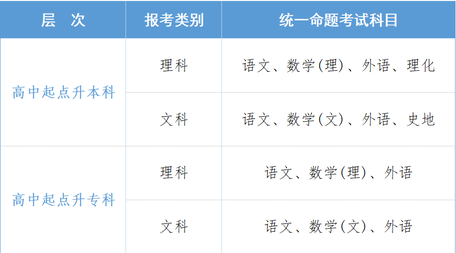 (二)录取批次。分高中起点升本科、专科起点升本科、高中起点升专科3个录取批次。
